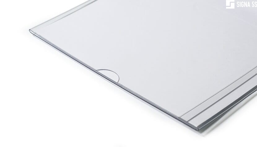 - Szyld regałowy wykonany z przezroczystej folii PET o twardej strukturze z paskiem magnetycznym