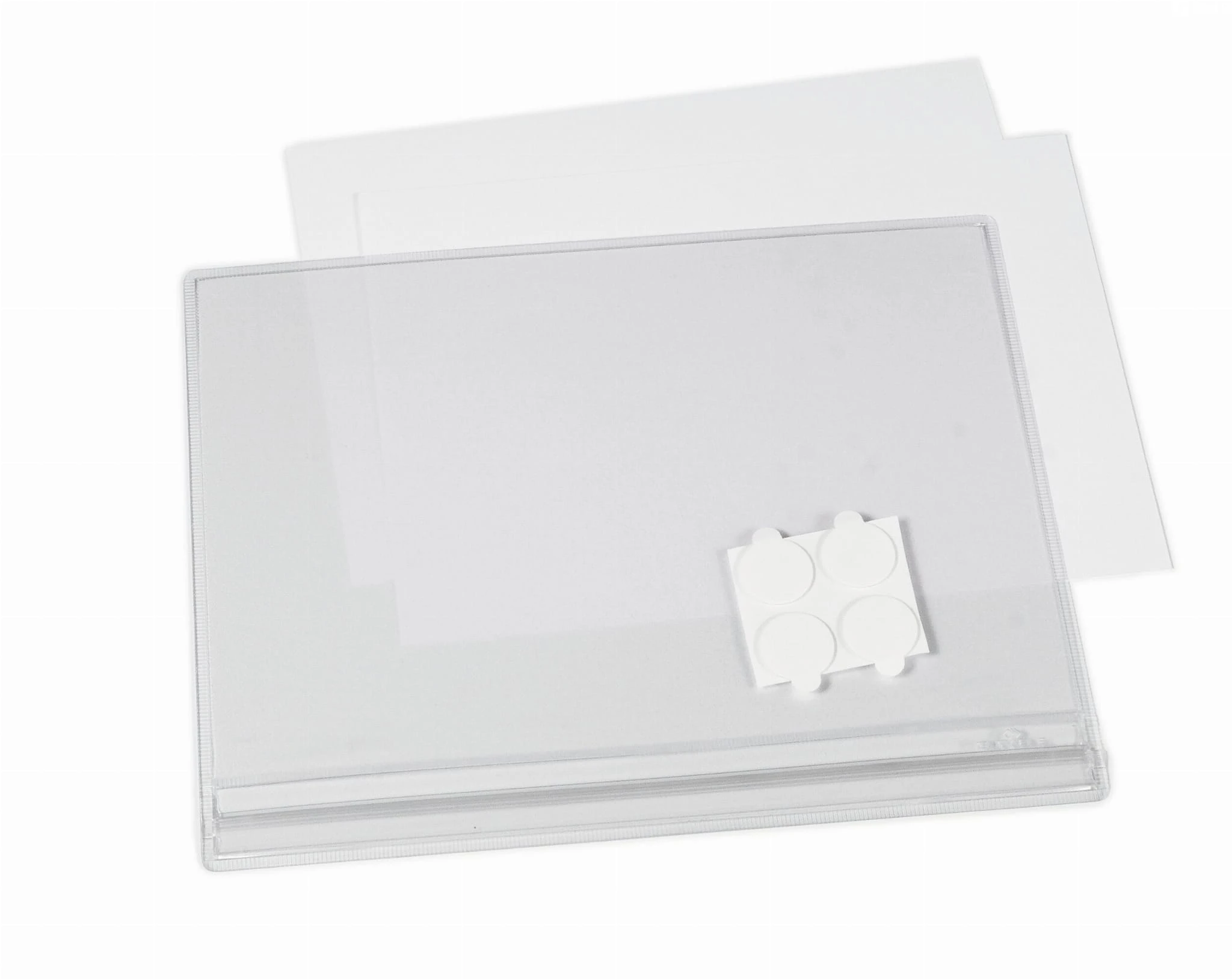 - Mocowanie za pomocą 4 samoprzylepnych i usuwalnych kółeczek mocno przezroczystych (w komplecie), umożliwiających dowolne umieszczenie przezroczystej kieszeni