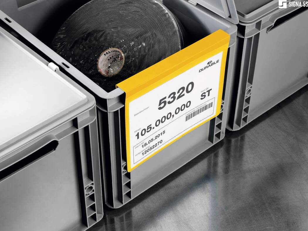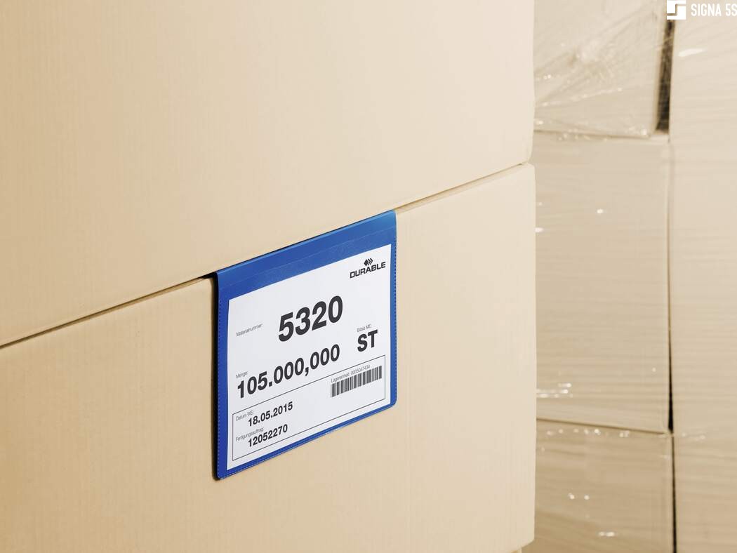 - Samoprzylepna kieszeń magazynowa w formacie A5 w poziomie z mocną zakładką do zawieszenia na kartonach, pudłach i innych pojemnikach