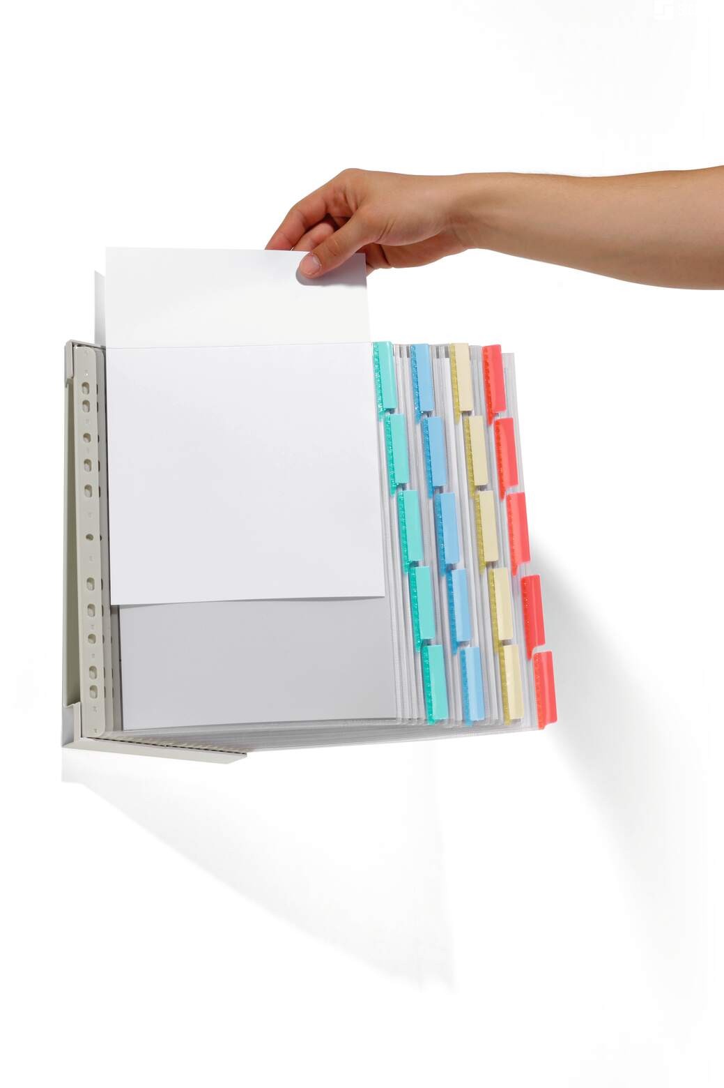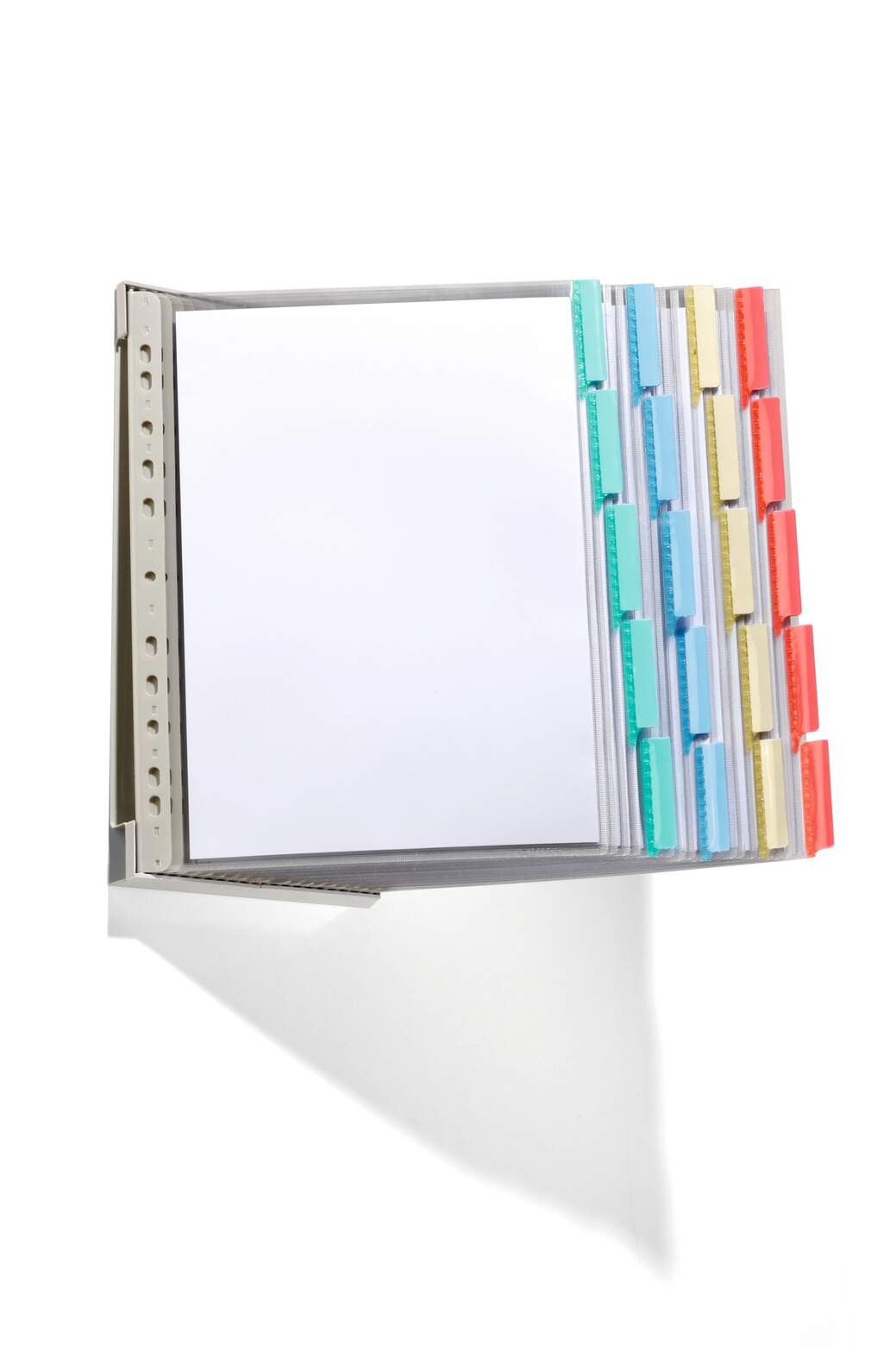 - Naścienny system prezentacyjny z 20 panelami prezentacyjnymi FUNCTION w formacie A4 (po 5 sztuk w kolorze czerwonym, żółtym, zielonym i niebieskim)