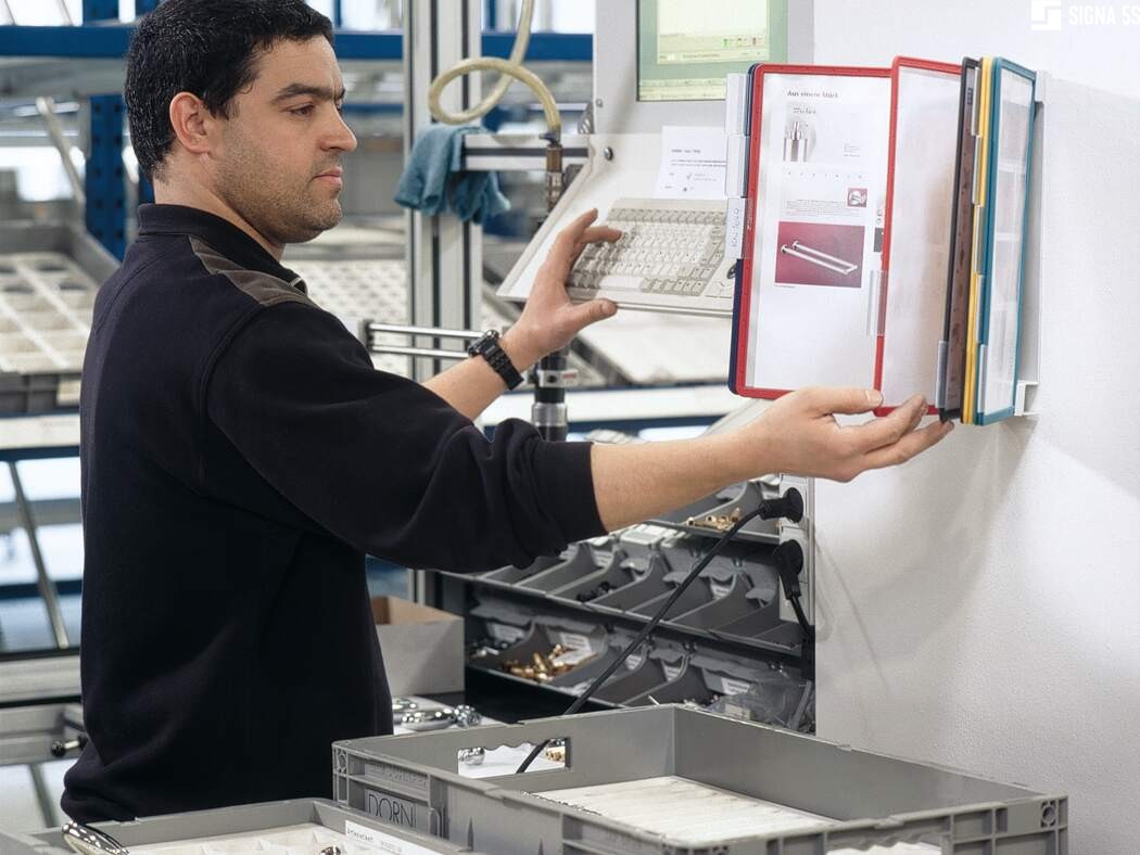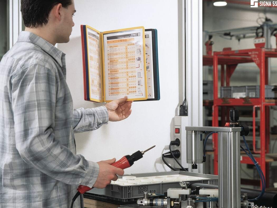 - Uchwyt naścienny z 10 panelami prezentacyjnymi SHERPA w formacie A4, po 2 sztuki w kolorze czarnym, czerwonym, żółtym, zielonym i granatowym