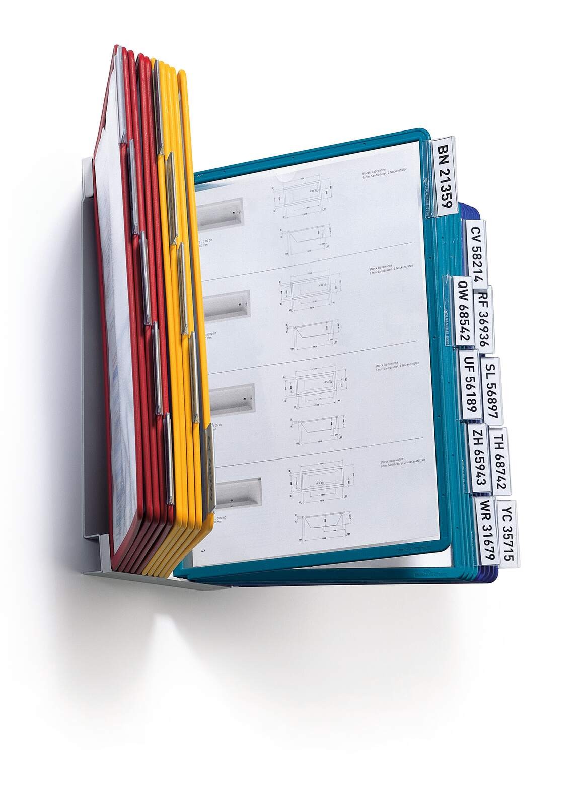 - Naścienny uchwyt do wpinania paneli do prezentacji z 20 panelami SHERPA w formacie A4, po 5 sztuk w kolorze czerwonym, żółtym, zielonym i granatowym