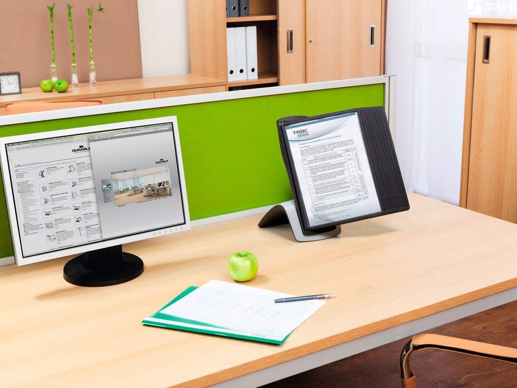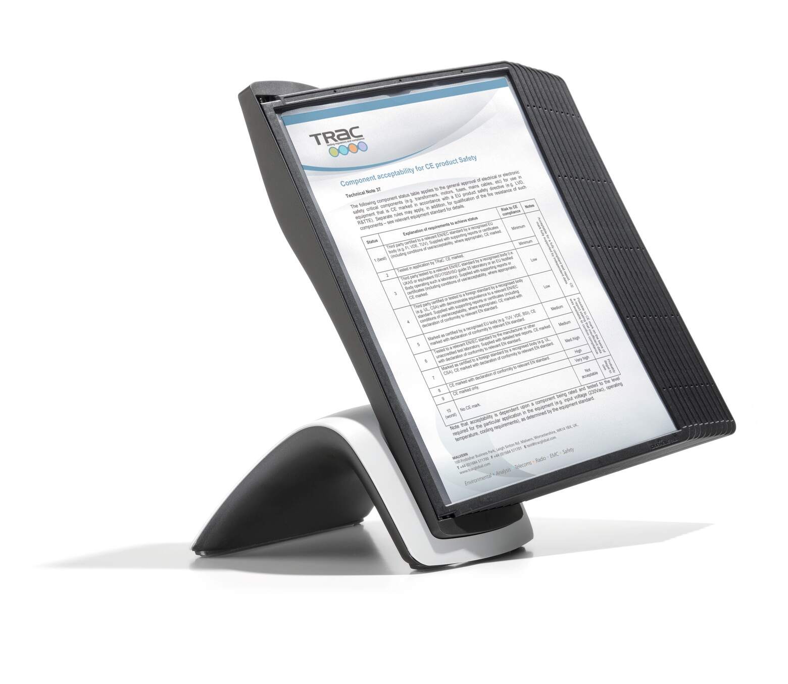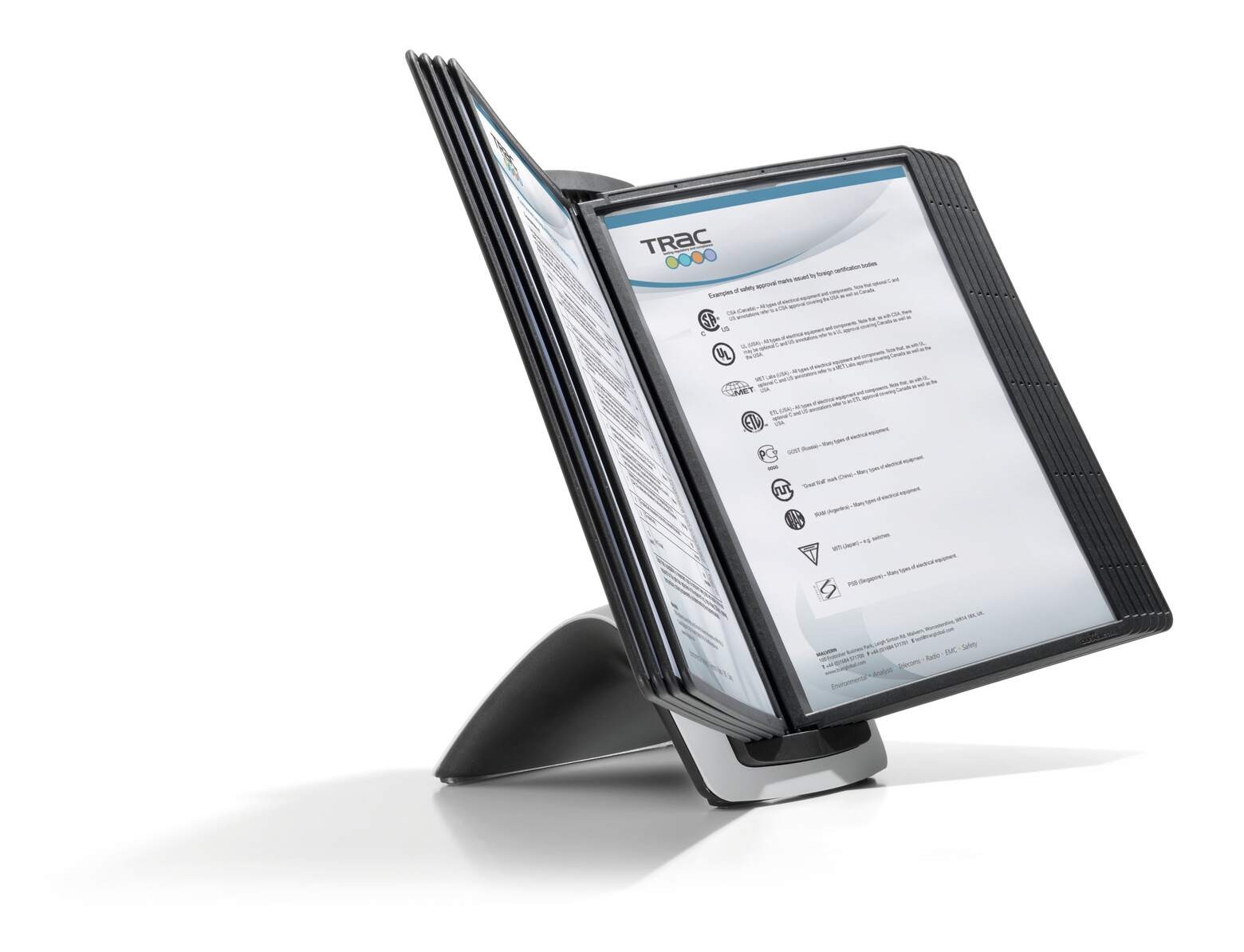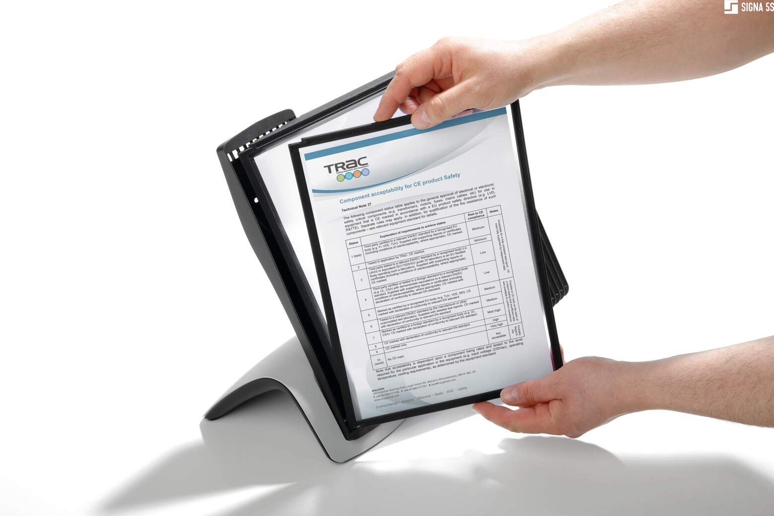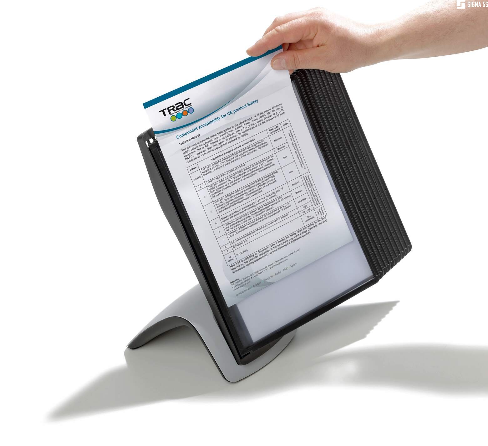 Kompletny zestaw paneli prezentacyjnych to idealne rozwiązanie do prezentacji dokumentów na stole. Stojak stołowy z 10 panelami prezentacyjnymi SHERPA w formacie A4 zapewnia wygodne i estetyczne wyeksponowanie informacji. Antypoślizgowy stojak stołowy w kolorze czarnym/szarym gwarantuje stabilność konstrukcji nawet przy intensywnym użytkowaniu. Panele prezentacyjne wykonane z polipropylenu z kolorową ramką i folią nadającą się do skanerów zapewniają wyjątkową czytelność dokumentów i minimalizują efekt odbicia światła. Produkt jest wyposażony w zakładki indeksujące z pustymi wkładami do opisu paneli, co ułatwia organizację prezentowanych materiałów. Dodatkowo, praktyczny mechanizm umożliwia łatwą wymianę paneli, co czyni obsługę stojaka jeszcze bardziej wygodną. Produkt objęty jest 5-letnią gwarancją, co stanowi dodatkową pewność jakości i trwałości.