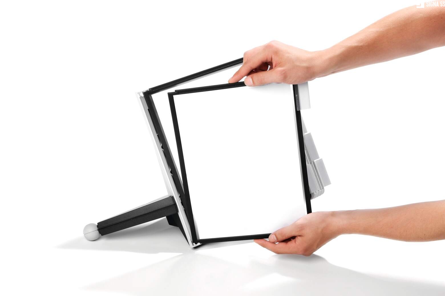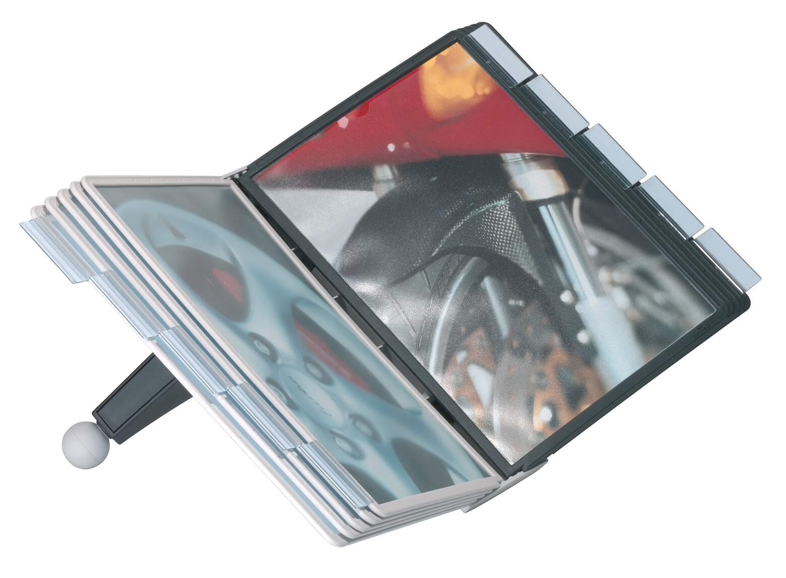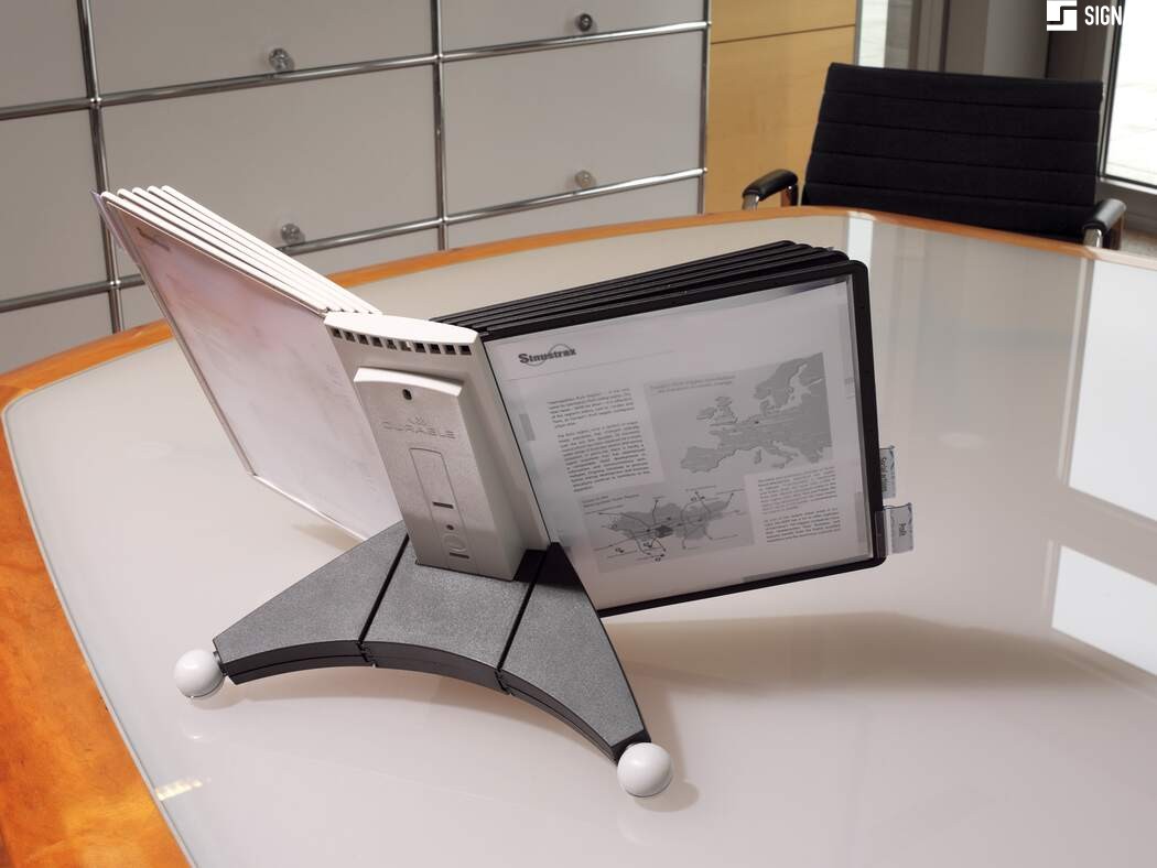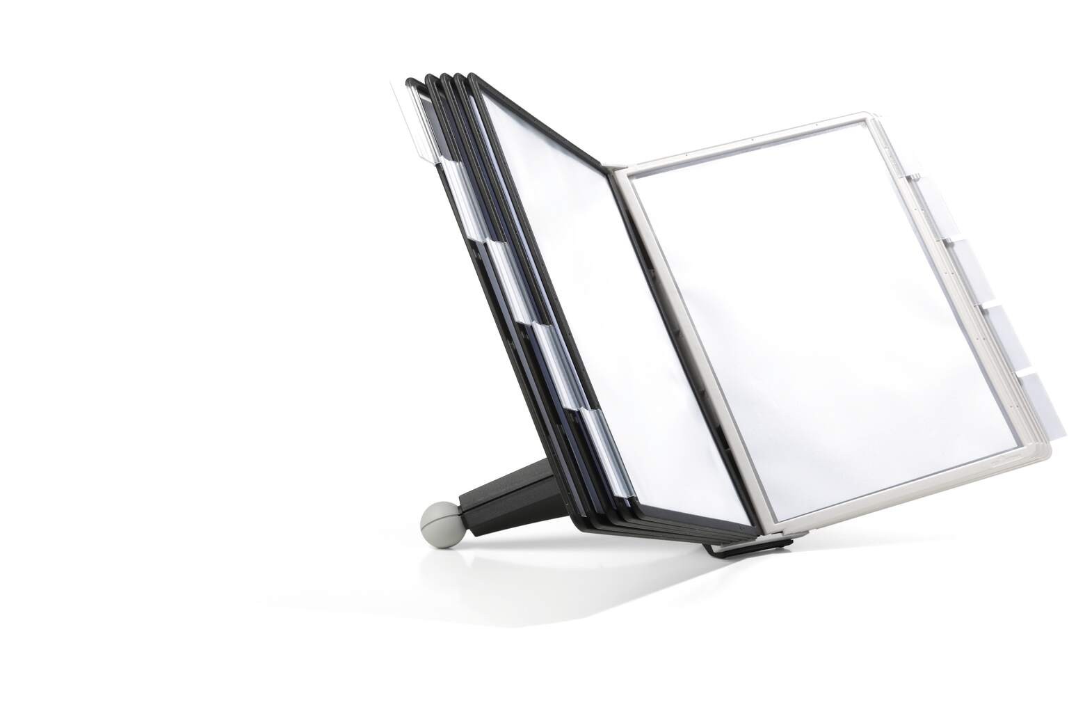 - Uchwyt stołowy z 10 panelami prezentacyjnymi SHERPA w formacie A4 (kolor -00: po 5 sztuk w kolorze czerwonym i czarnym, kolor -22: wersja szara i czarna)