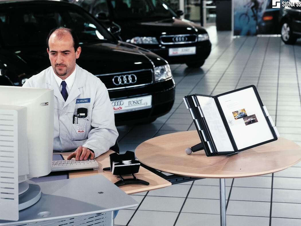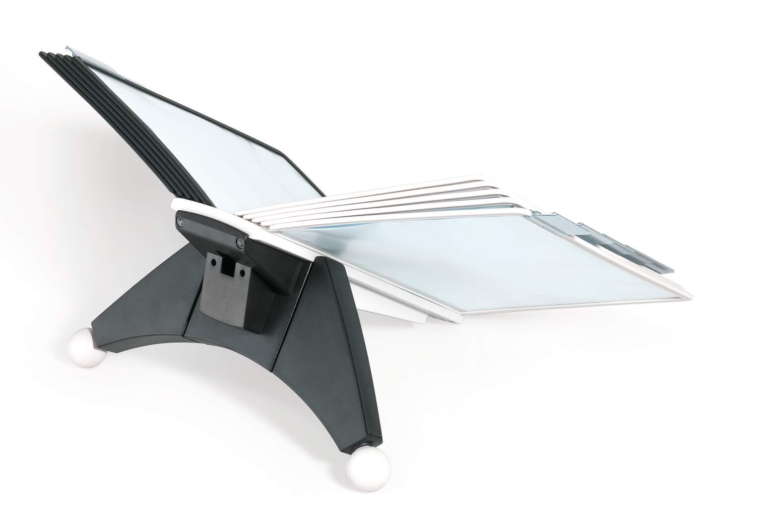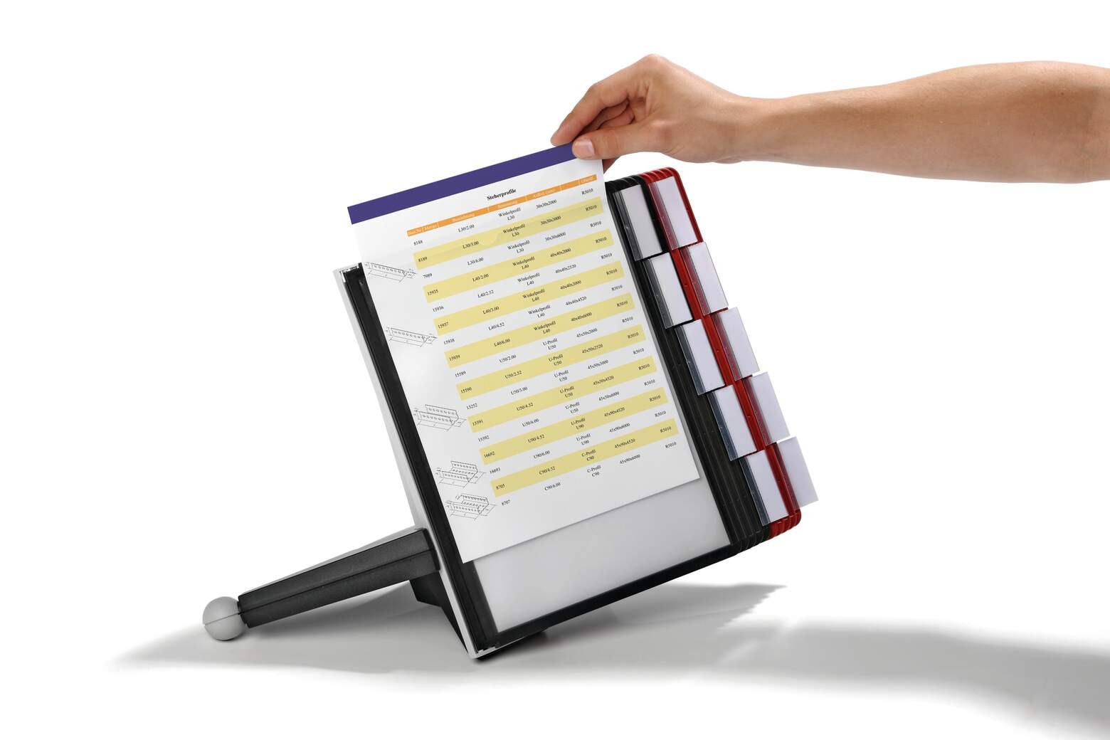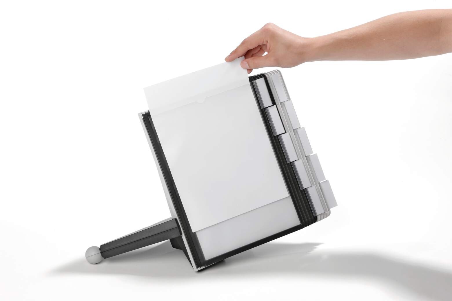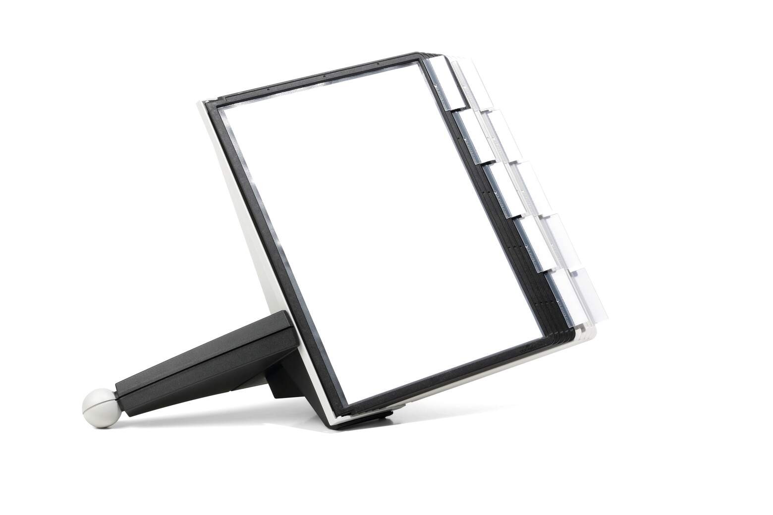 - Uchwyt stołowy z 10 panelami prezentacyjnymi SHERPA w formacie A4 (kolor -00: po 5 sztuk w kolorze czerwonym i czarnym, kolor -22: wersja szara i czarna)