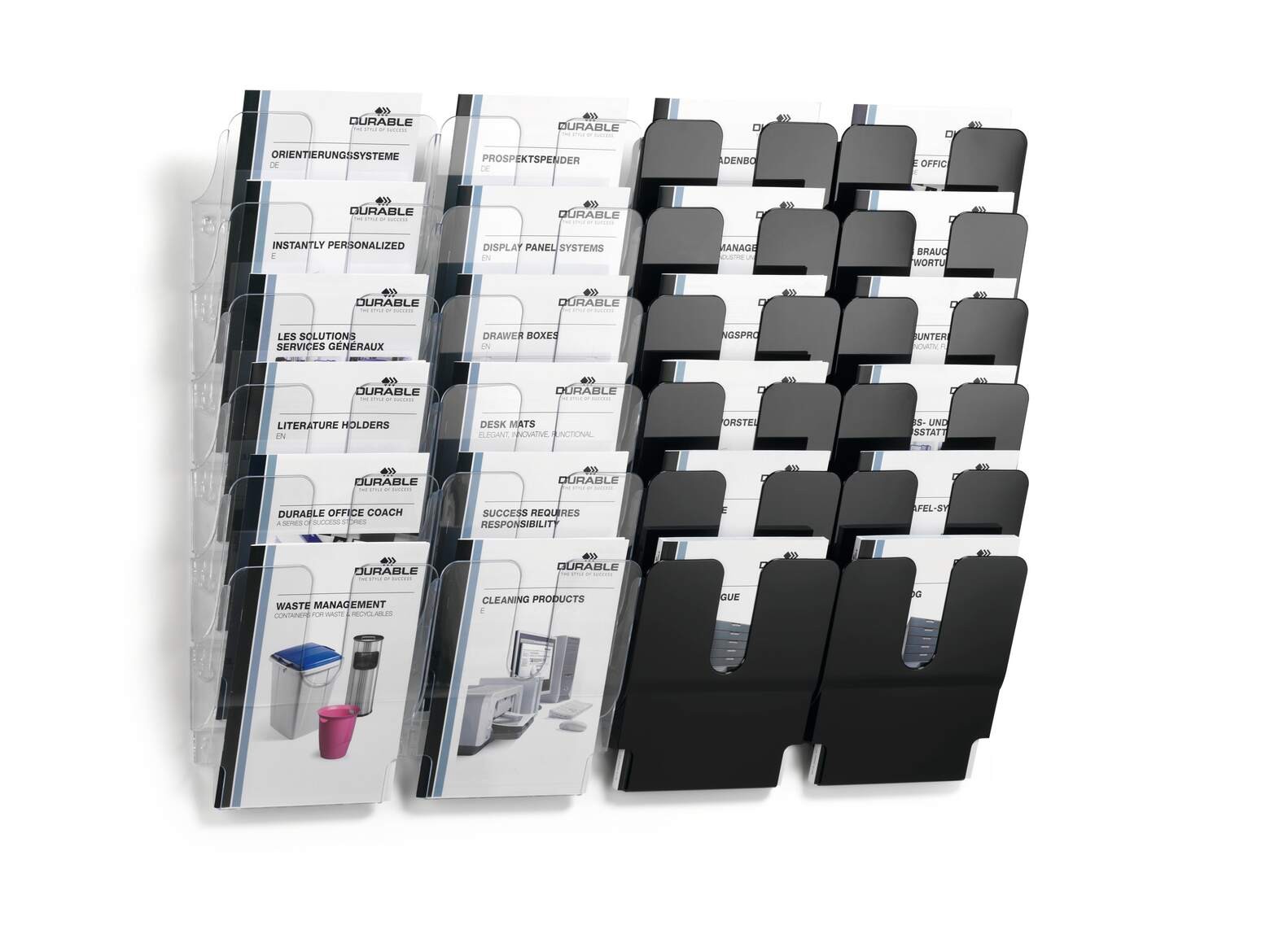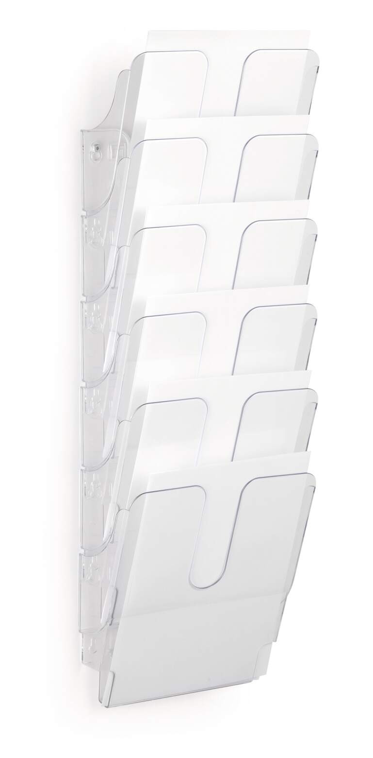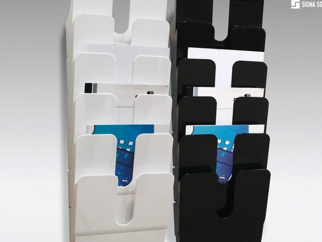 Ten naścienny zasobnik to doskonałe rozwiązanie do przechowywania prospektów lub dokumentów w formacie A4, ustawionych pionowo lub poziomo. Posiada pojemność 23 mm, możliwość rozbudowy i maksymalną nośność około 6 kg. Doskonale sprawdza się jako pomocnik w recepcji, poczekalniach oraz na targach handlowych.