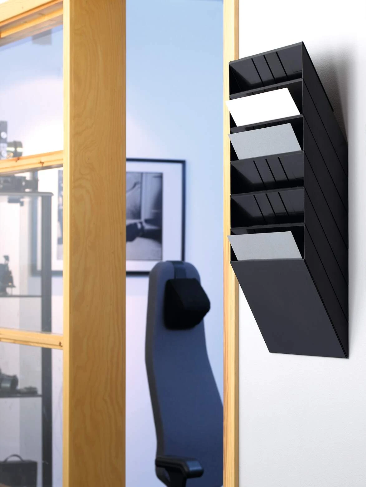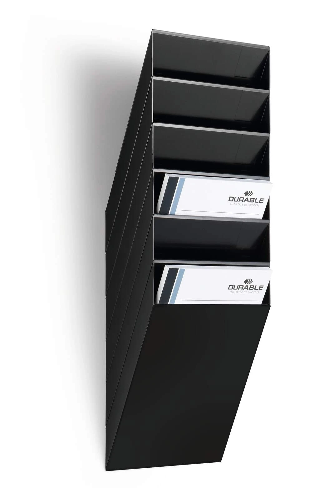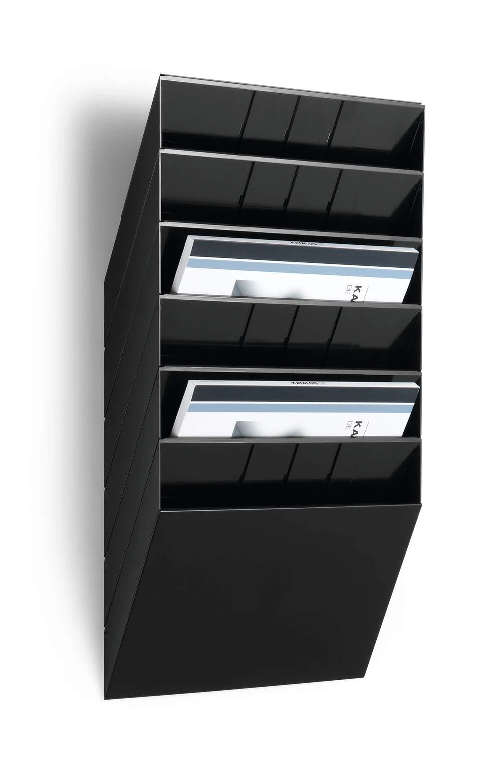 - Sześcioczęściowy naścienny zasobnik na prospekty bądź dokumenty, format A4 w pionie i poziomie
