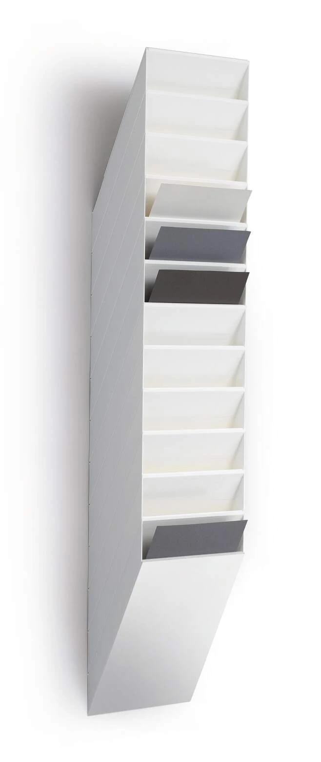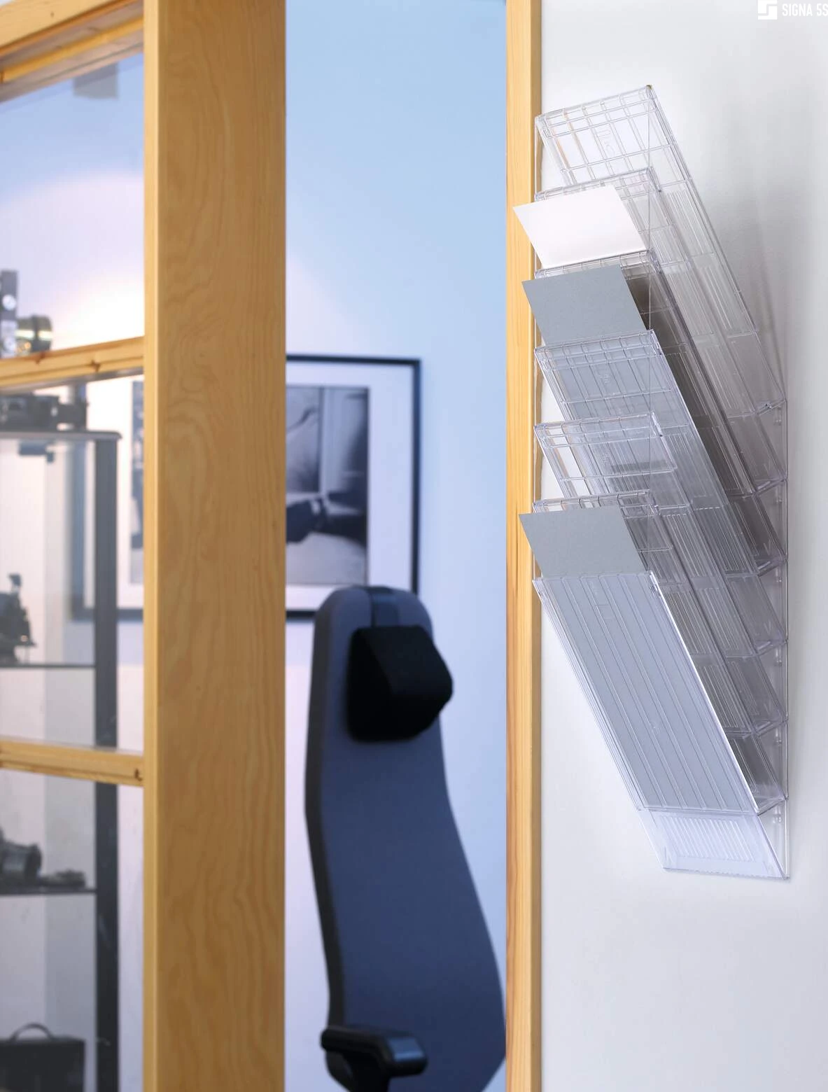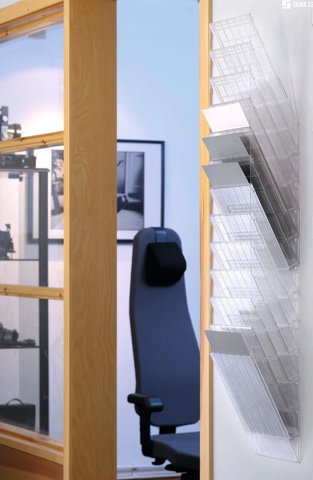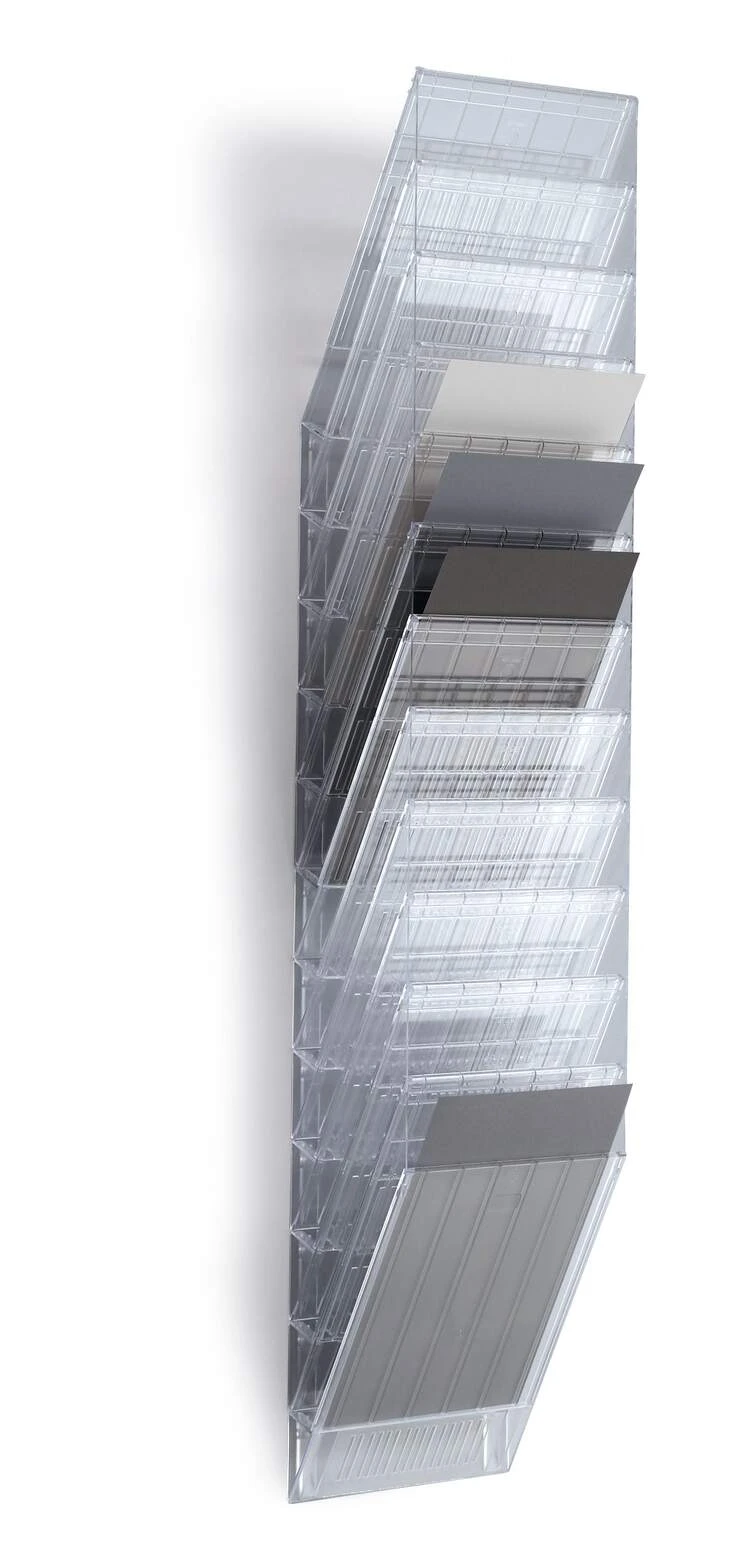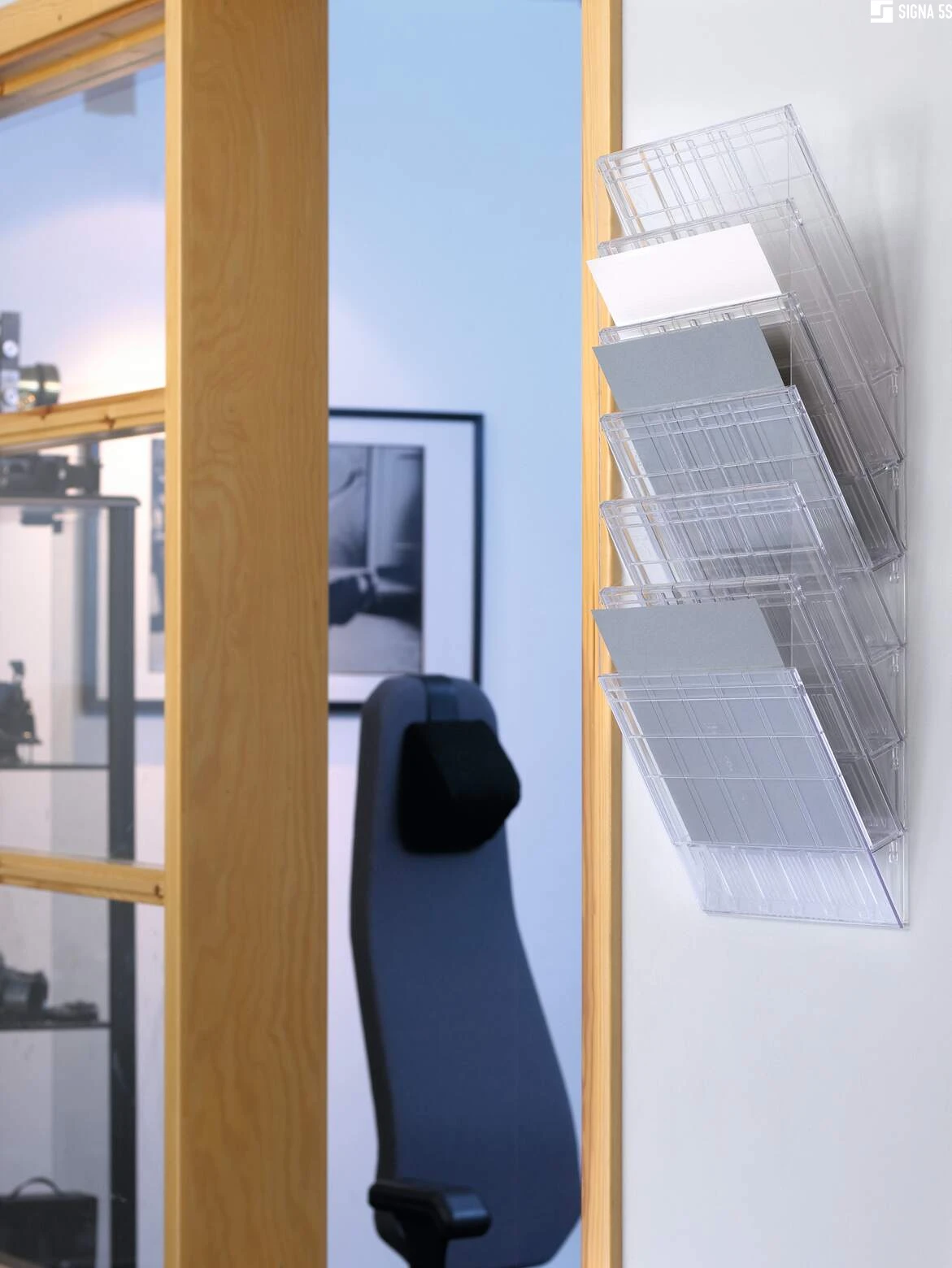 Sześcioczęściowy naścienny zasobnik na prospekty lub dokumenty w formacie A4 w pionie, oferujący pojemność 23 mm. Możliwość rozbudowy oraz maksymalna nośność około 6 kg sprawiają, że doskonale sprawdza się jako pomocnik w recepcji, poczekalniach oraz na targach handlowych, ułatwiając organizację dokumentów i materiałów reklamowych.
