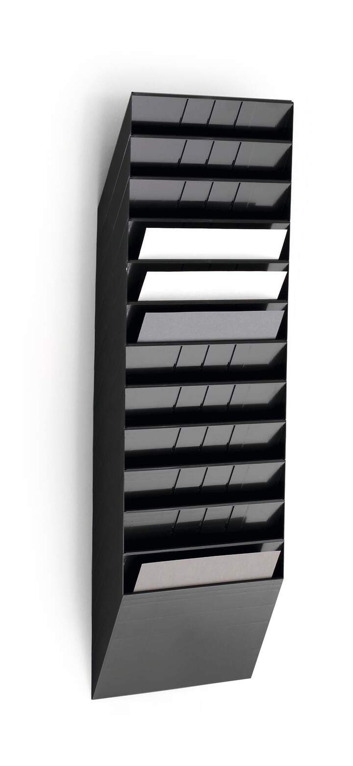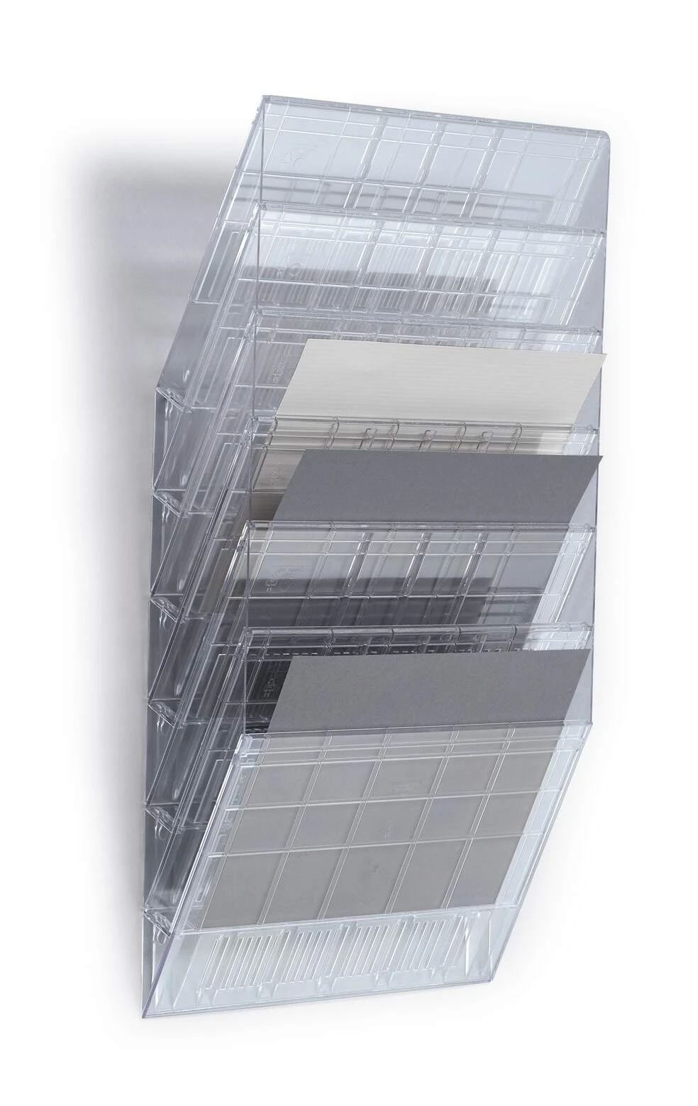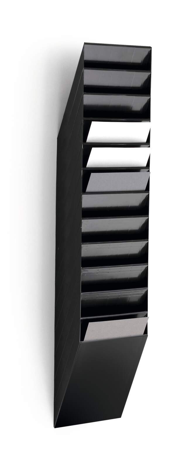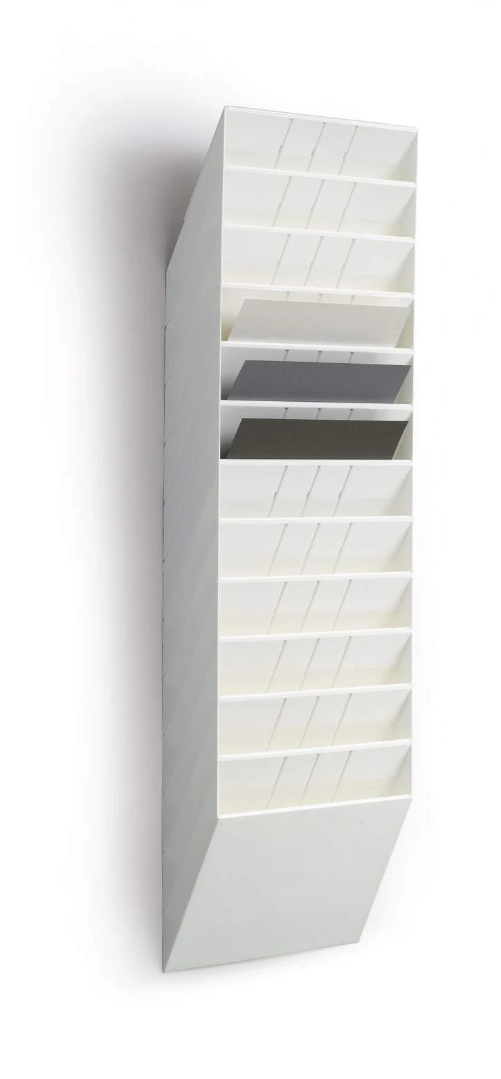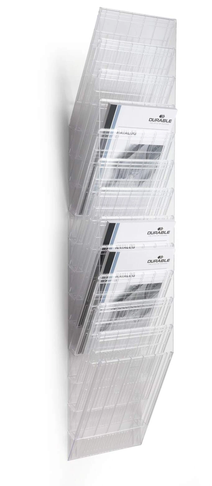 Sześcioczęściowy naścienny zasobnik na prospekty lub dokumenty w formacie A4 w pionie, oferujący pojemność 23 mm. Możliwość rozbudowy oraz maksymalna nośność około 6 kg sprawiają, że doskonale sprawdza się jako pomocnik w recepcji, poczekalniach oraz na targach handlowych, ułatwiając organizację dokumentów i materiałów reklamowych.
