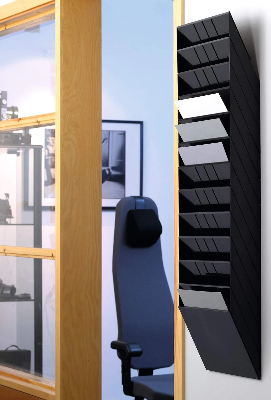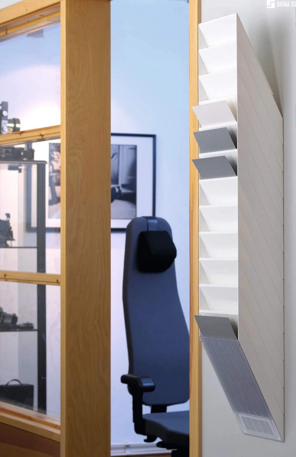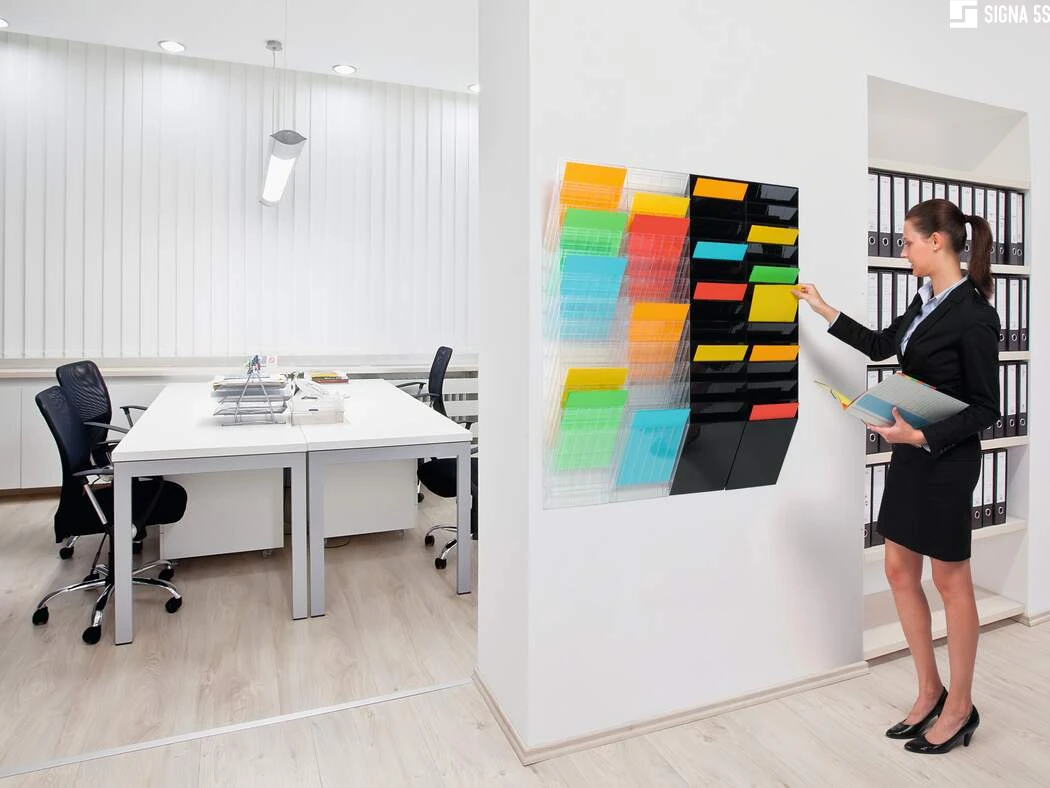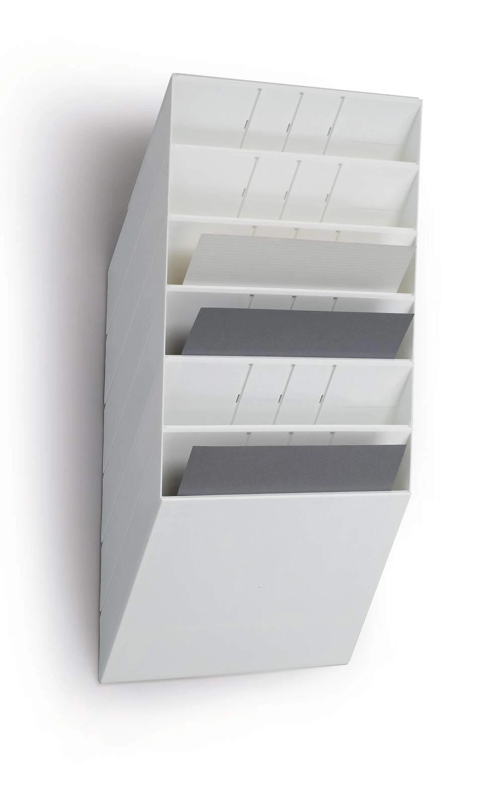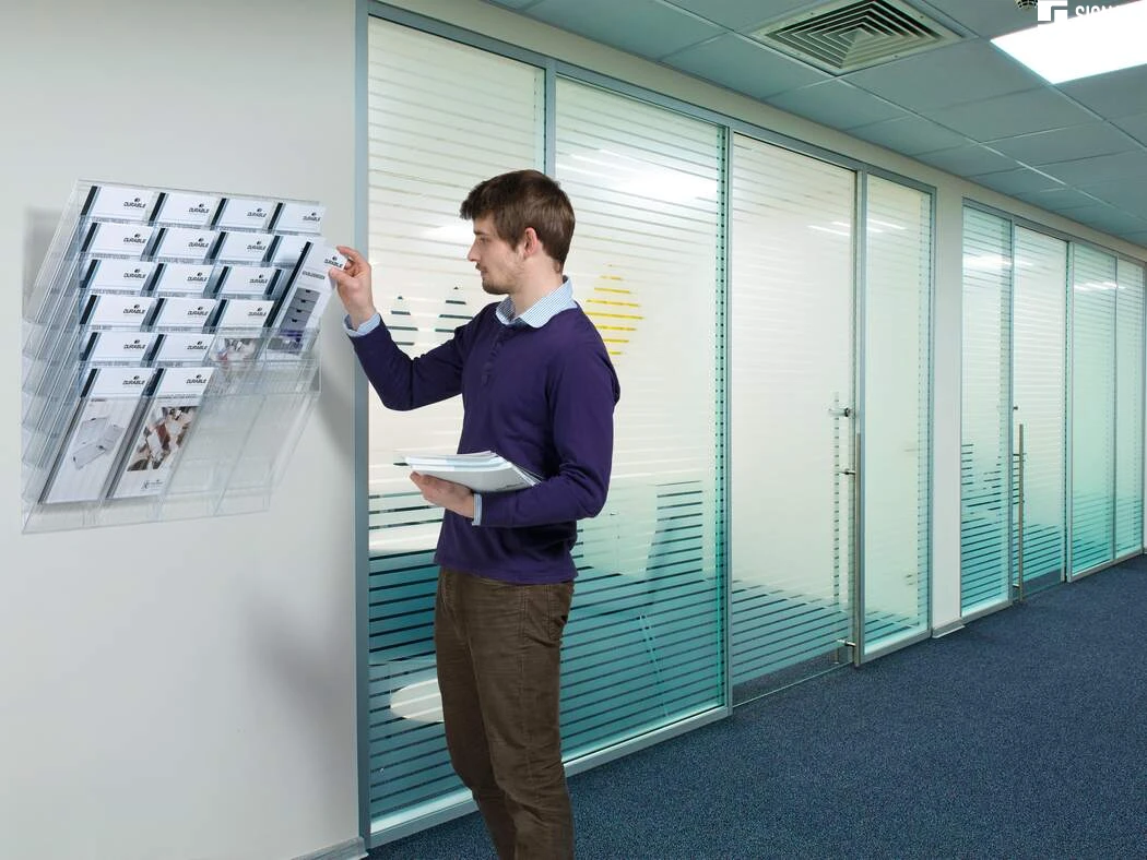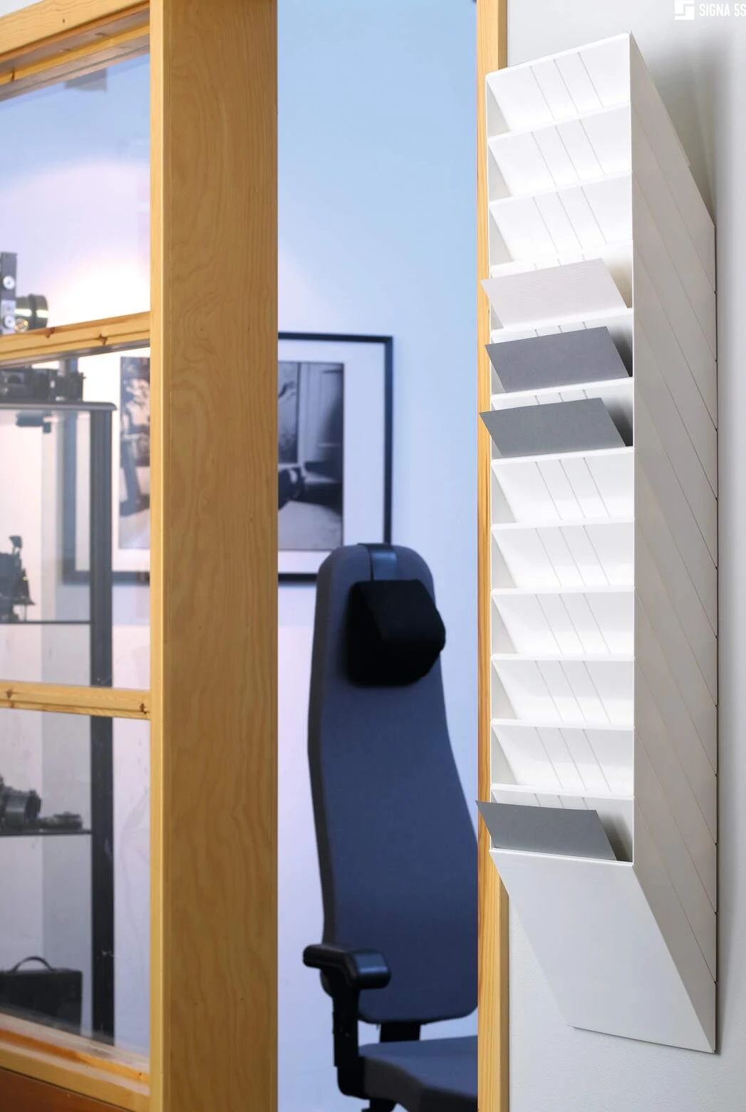 Sześcioczęściowy naścienny zasobnik na prospekty lub dokumenty w formacie A4 w pionie, oferujący pojemność 23 mm. Możliwość rozbudowy oraz maksymalna nośność około 6 kg sprawiają, że doskonale sprawdza się jako pomocnik w recepcji, poczekalniach oraz na targach handlowych, ułatwiając organizację dokumentów i materiałów reklamowych.
