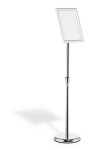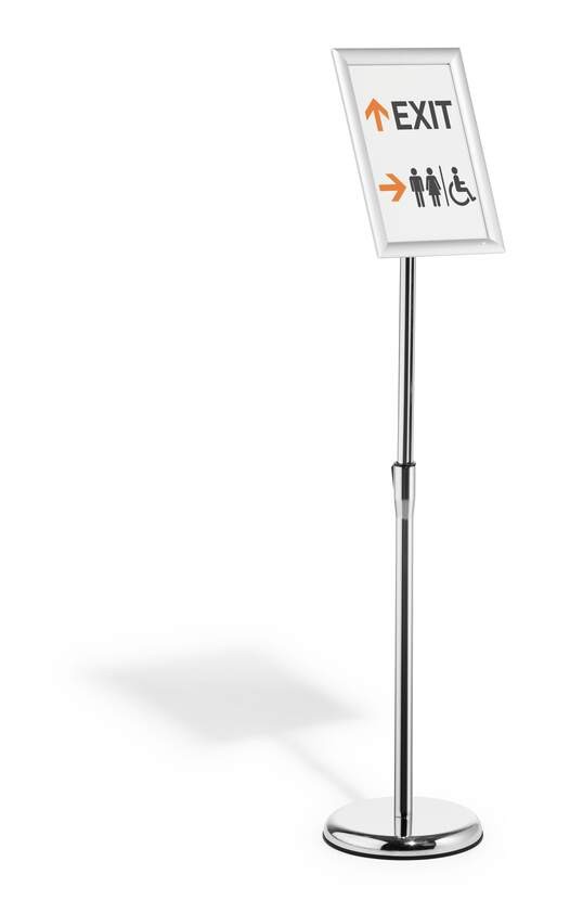 Stojak informacyjny do szybkiego montażu z wytrzymałą składaną ramą aluminiową DIN A4, anodowaną na srebrno. Wysoką stabilność zapewnia opcjonalne wypełnienie podstawy (średnica 250 mm) piaskiem. Dodatkowy produkt do zakupu DURABLE Piasek Art. No. Nr 3335-16, maks. waga ok. 1,1 kg. Okrągła podstawa z dołączonym gumowym pierścieniem zapobiega rysowaniu podłogi. Regulacja wysokości za pomocą drążka teleskopowego (można regulować w zakresie od 770 mm do maksymalnej wysokości 1205 mm w formacie pionowym). Składaną ramę można łatwo obrócić z formatu pionowego do poziomego. Kąt czytania regulowany przegubem kulowym. Folia ochronna o niskim współczynniku odbicia światła, odporna na promieniowanie UV. Odporny na uderzenia tylny panel z polistyrenu. Ścięte narożniki. Idealne rozwiązanie do gastronomii, handlu detalicznego, muzeów, wystaw, hal targowych, recepcji i poczekalni, sal konferencyjnych itp.